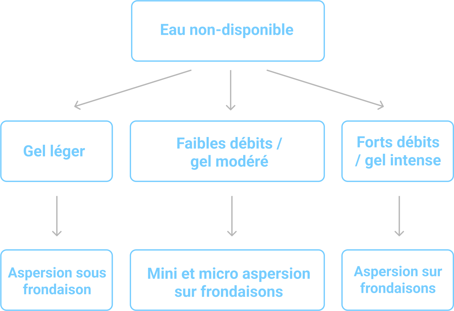 Pour faciliter l’absorption de la chaleur, il est possible d’irriguer la culture pour rendre la captation de chaleur plus efficiente car l’eau est un très bon conducteur thermique. Attention, le but est de rendre le sol humide et non pas détrempé, cette intervention a pour but de passer d’un sol sec à humide. Irriguer sur un sol déjà humide peut avoir un effet inverse et diminuer la restitution de la chaleur pendant la nuit. Il ne faut pas non-plus irriguer s’il n’est pas prévu que le sol soit exposé au soleil d’ici l’aléa gel.