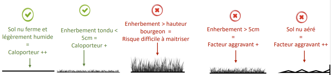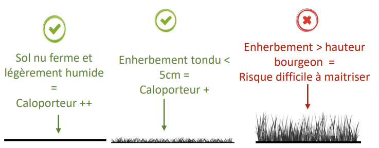 - Les couverts végétaux qui montent au-dessus des bourgeons peuvent dans certains cas faire office de protection mais des contre-exemples existent aussi. Cette technique n’est donc pas encore maitrisée d’autant plus que des couverts hauts, irréguliers et peu denses peuvent aggraver la situation en diminuant l’écoulement de l’air et en créant des poches d’air froid.
