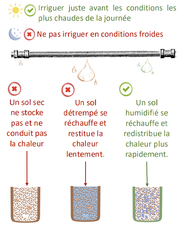 Pour permettre une meilleure absorption de la chaleur diurne par l’eau issue de l’irrigation, il est important d’appliquer l’arrosage un peu avant le zénith, de sorte que l’eau apportée ne soit pas plus froide que le sol, qu’elle soit présente dans les premiers centimètres au moment où le rayonnement est le plus important mais aussi pour que dans la mesure du possible, l’assombrissement du sol par l’eau rende le réchauffement plus efficient. Le gain de température fourni par le couple sol ferme et humide est évalué entre 0.6 et 1°C.