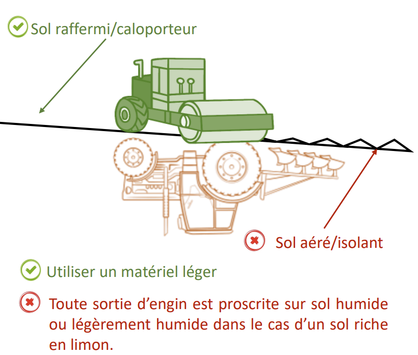 Un léger roulage pour raffermir le sol peut être utilisé si vous venez juste de travailler votre sol. Attention si le sol est trop humide il y a un risque de tassement et s’il est trop sec il n’y aura que peu d’effet du roulage.